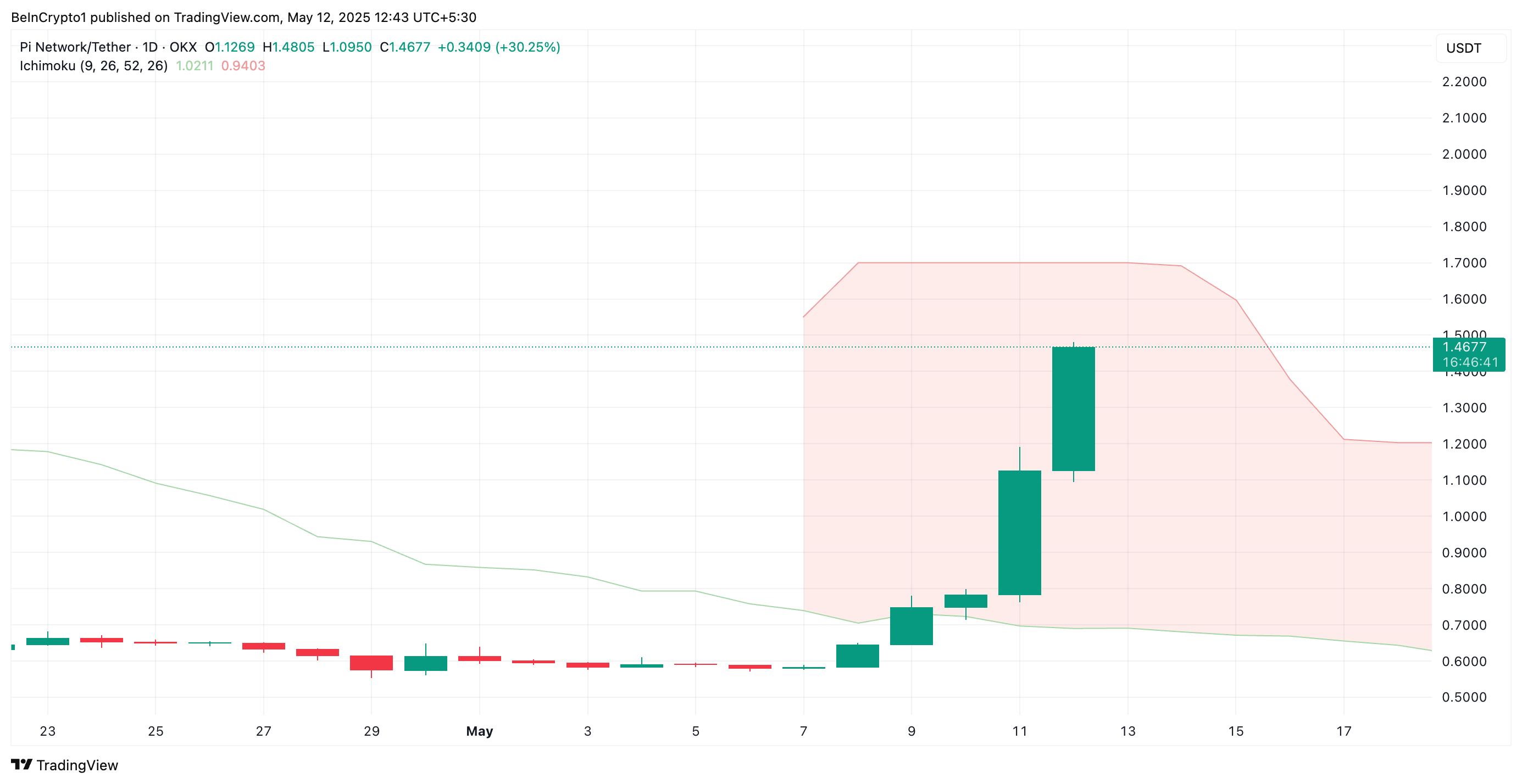 Lisäksi PI:n kaksinumeroiset nousut tänään ovat nostaneet sen hinnan Ichimoku Cloudin Leading Span A:n yläpuolelle ja kohti saman indikaattorin Leading Span B:tä.