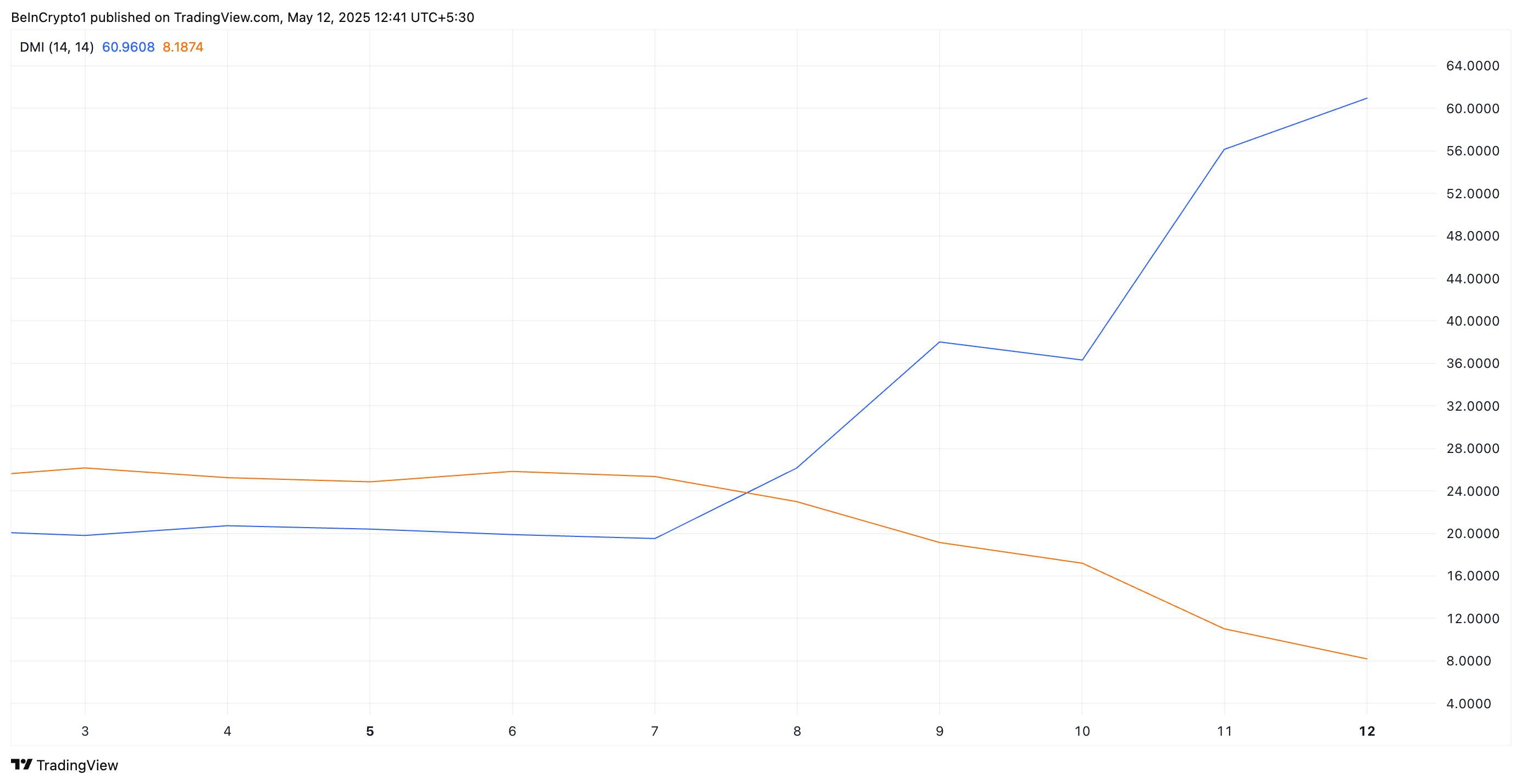 PI:n Directional Movement Indexin (DMI) arviointi osoittaa, että sen positiivinen suuntain ( +DI; sininen) on negatiivisen suuntain (—DI; oranssi) yläpuolella. Kirjoitushetkellä se on kaikkien aikojen korkeimmalla tasolla, 60,96.