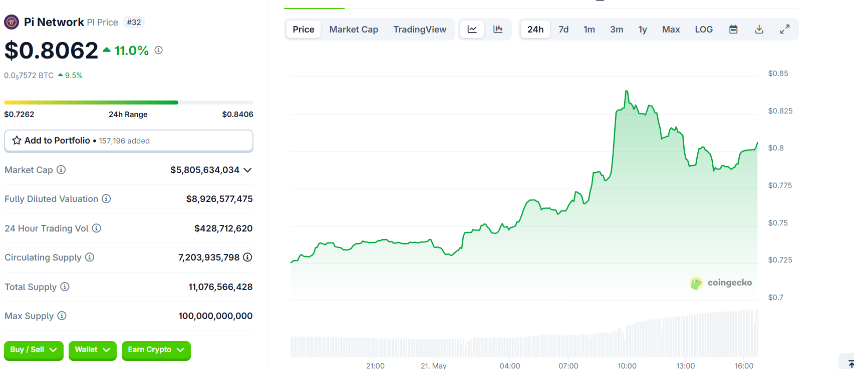 Raportin välittömänä seurauksena Pi Coinin hinta nousi 11 %. CoinGeckon tiedot osoittavat, että PI Coinin hinta oli 0,8062 dollaria tätä kirjoitettaessa.