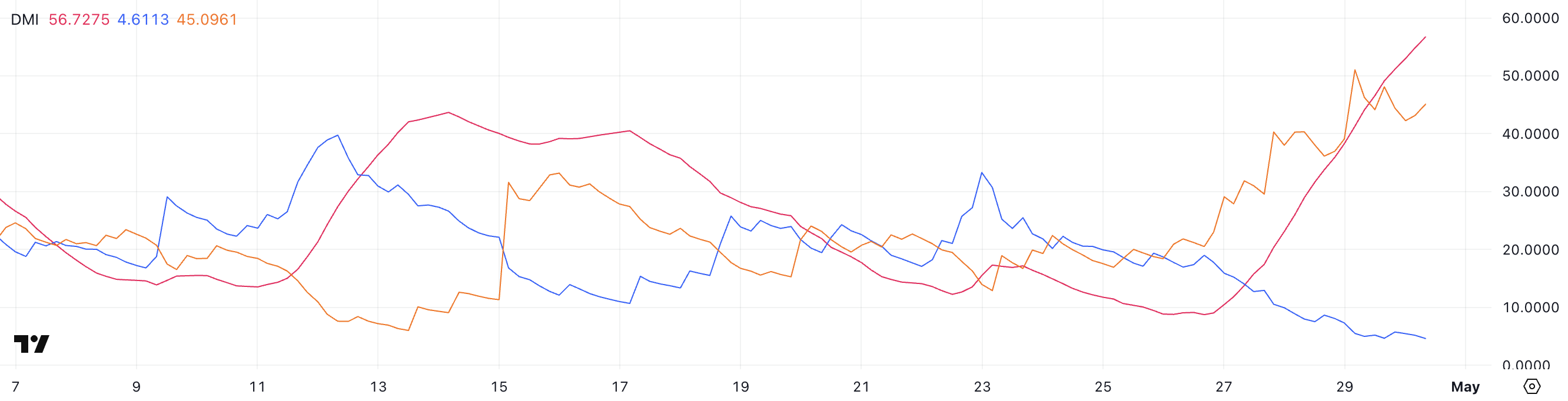 DMI (Directional Movement Index) -kaavio Pi Networkille paljastaa merkittävän muutoksen trendin vahvuudessa, kun ADX (Average Directional Index) on noussut 56,72:een vain 10,48:sta kolme päivää sitten.