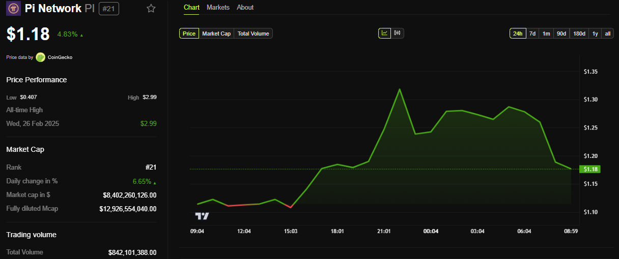 Näiden kehitysten keskellä Pi Networkin PI-kolikko on noussut lähes 5 % viimeisen 24 tunnin aikana. Tätä kirjoitettaessa se oli kaupankäynnissä 1,18 dollarilla.