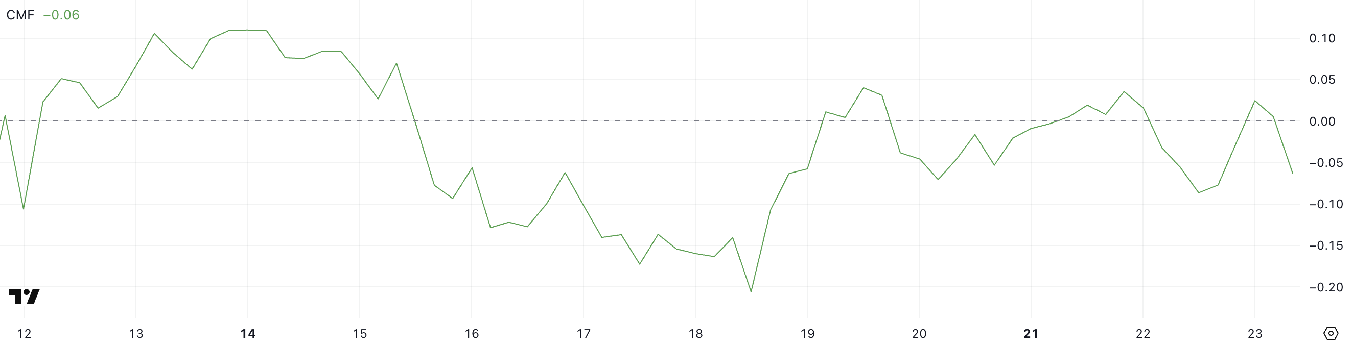 Pi Networkin Chaikin Money Flow (CMF) on tällä hetkellä -0,06, toivuttuaan -0,09:stä neutraaliin (0) aiemmin tänään ja laskenut jälleen viimeisten tuntien aikana.