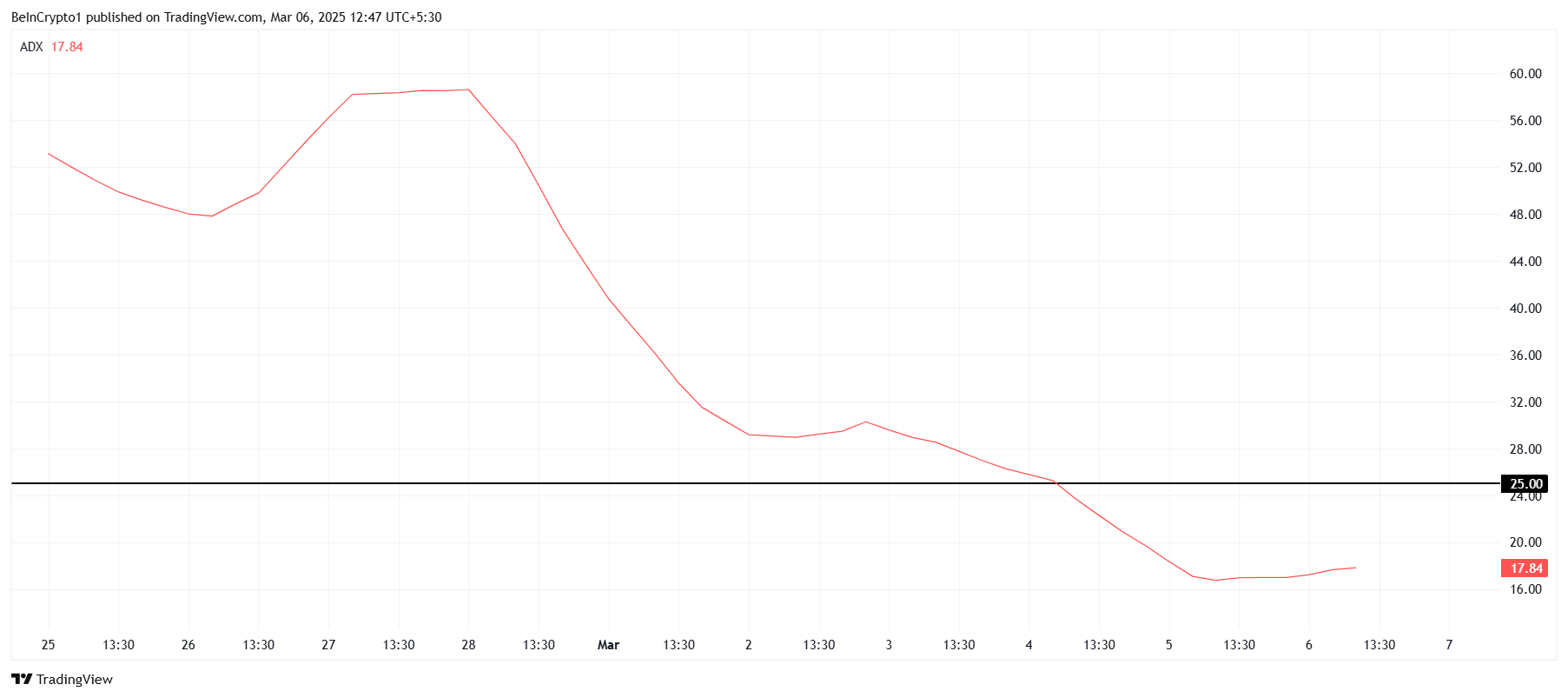 Pi Network on myös osoittanut parannusta makrotason tunnelmassaan, erityisesti teknisten indikaattorien, kuten Average Directional Indexin (ADX), avulla. ADX laski alle kriittisen 25,0 kynnysarvon helmikuun lopussa ja maaliskuun alussa, mikä viittaa siihen, että aiempi laskusuuntaus menetti voimaansa. Tämä muutos on keskeinen mahdollisen elpymisen kannalta.