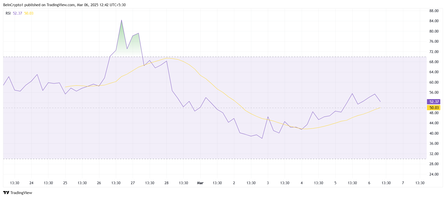 Relative Strength Index (RSI) on äskettäin palannut nousualueelle, mikä viittaa siihen, että Pi Networkin noususuuntaus voimistuu. Tämä on positiivinen merkki siitä, että laajemmat markkinaolosuhteet alkavat parantua.