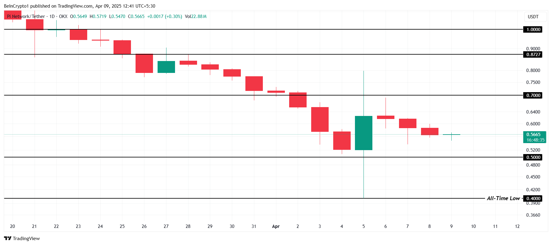 Pi Networkin hinta on tällä hetkellä 0,56 dollaria, juuri kriittisen 0,50 dollarin tuen yläpuolella. Tämä hinta on edelleen alle 0,70 dollarin vastustason, jota Pi on kamppaillut ylittääkseen pitkään. Äskettäin Pi Network muodosti uuden kaikkien aikojen alhaisimman (ATL) 0,40 dollaria, mikä vahvistaa sen kamppailua säilyttää härkämäinen suuntaus.