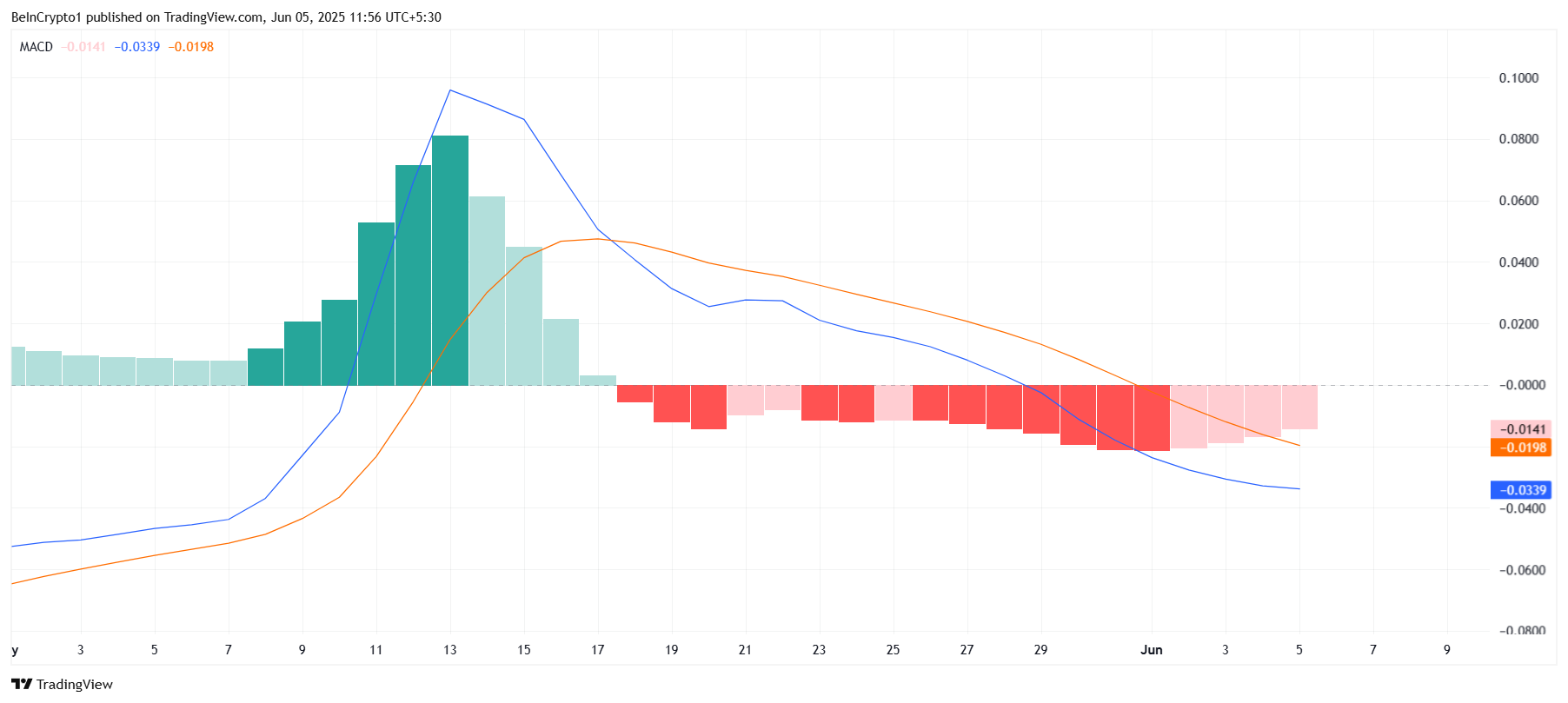 Pi Networkin makrotunnelma on edelleen haastava laajempien markkinaolosuhteiden vuoksi. Moving Average Convergence Divergence (MACD) -indikaattori osoittaa, että altcoin kamppailee yhä karhumarkkinan tunnelman kanssa. MACD-histogrammin punaiset palkit, vaikka ne ovatkin hiipumassa, osoittavat, että myyntipaine on yhä markkinoilla.
