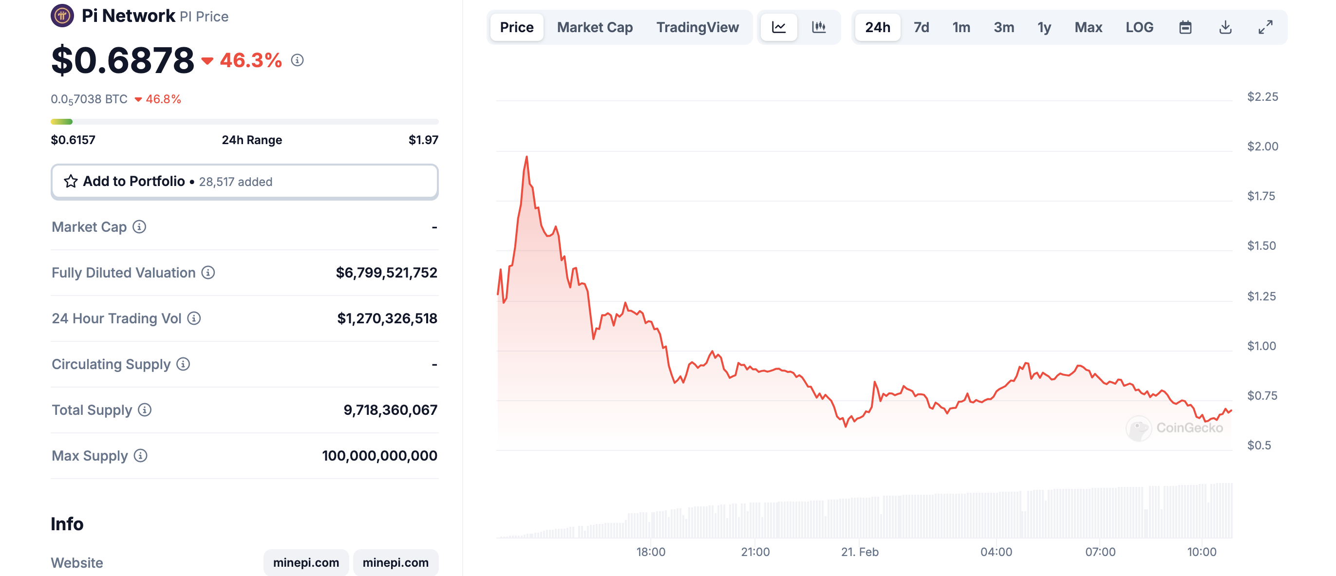 Hinta on pudonnut 46 % viimeisen 24 tunnin aikana. Kirjoitushetkellä PI:n hinta oli 0,68 dollaria. Vertailun vuoksi vastaavat Smart Contract Platform -kryptovaluutat ovat nousseet 1,30 %, mikä korostaa PI:n alisuoriutumista markkinoilla.