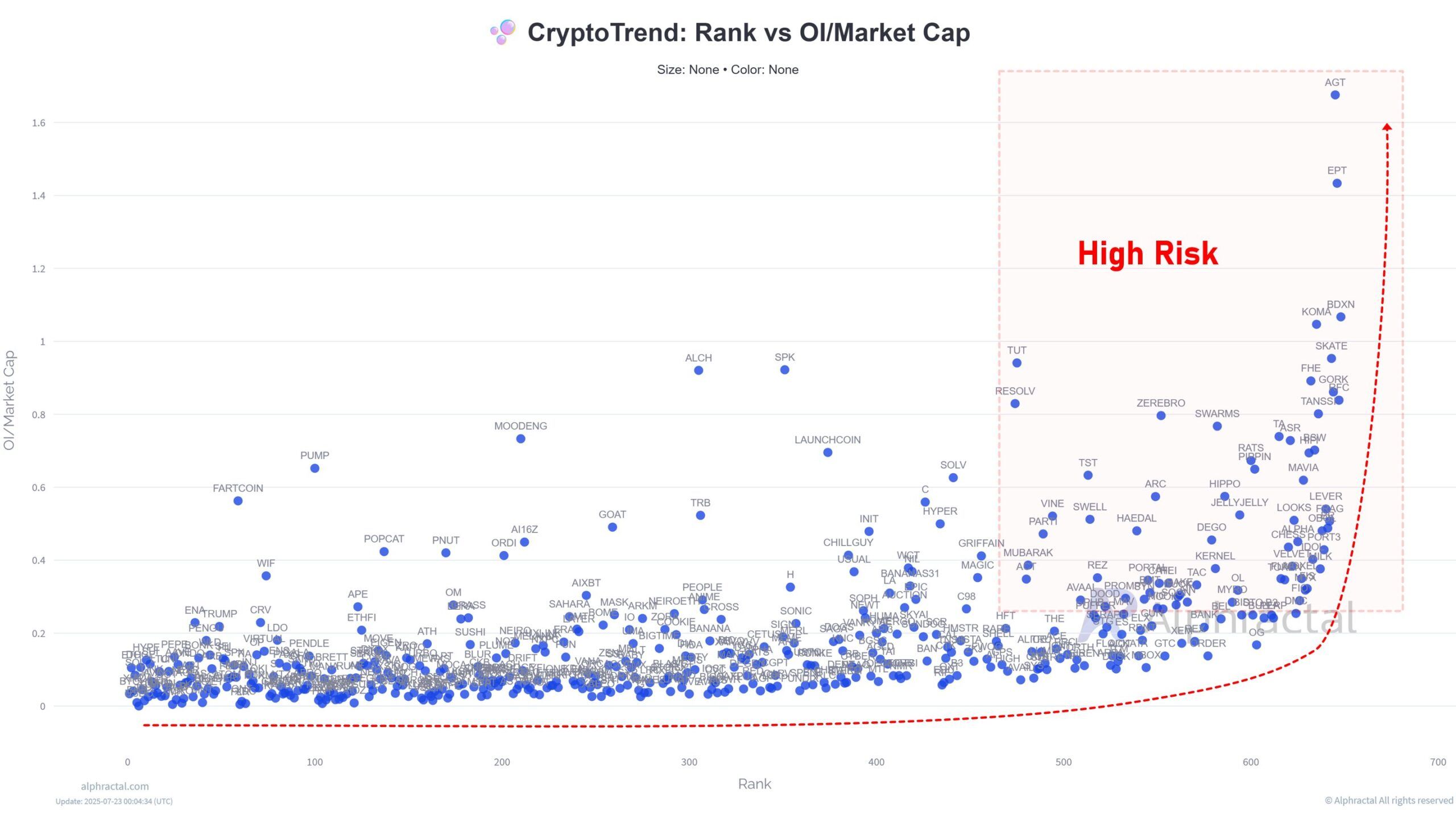 Silti analyytikot kuten João Wedson pysyvät skeptisinä erittäin pienikapasiteettisten altcoinien suhteen—etenkin niiden, jotka ovat top 300:n ulkopuolella. Näiden kolikoiden markkina-arvo on yleensä alle 200 miljoonaa dollaria. Hän mainitsee Open Interest to Market Cap Ratio -tunnusluvun varoitussignaalina näille kolikoille.