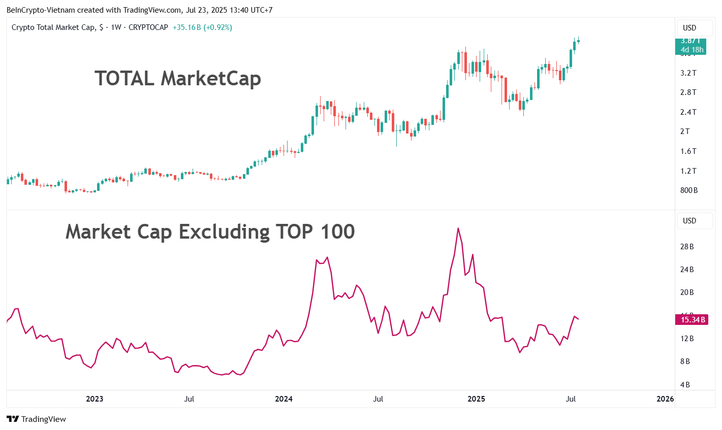 TradingView’n tiedot tukevat tätä. Vaikka kryptomarkkinoiden kokonaisarvo lähestyy 4 biljoonaa dollaria, markkina-arvo ilman top 100 altcoinia on vain 15,4 miljardia dollaria.