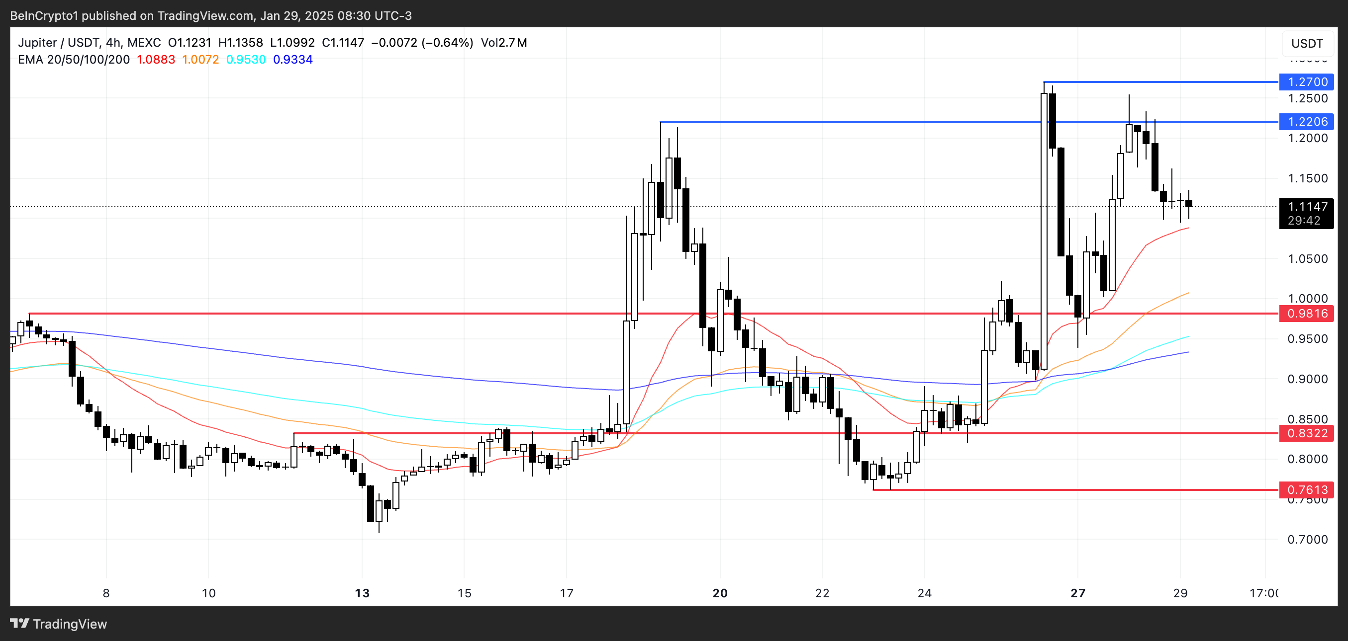 Jos sama suuntaus jatkuu, JUP voi testata 1,22 ja 1,27 dollaria pian. Jos suunta kuitenkin kääntyy, se voi pudota 0,98 dollariin, ja lisälasku 0,83 tai jopa 0,76 dollariin on mahdollinen.