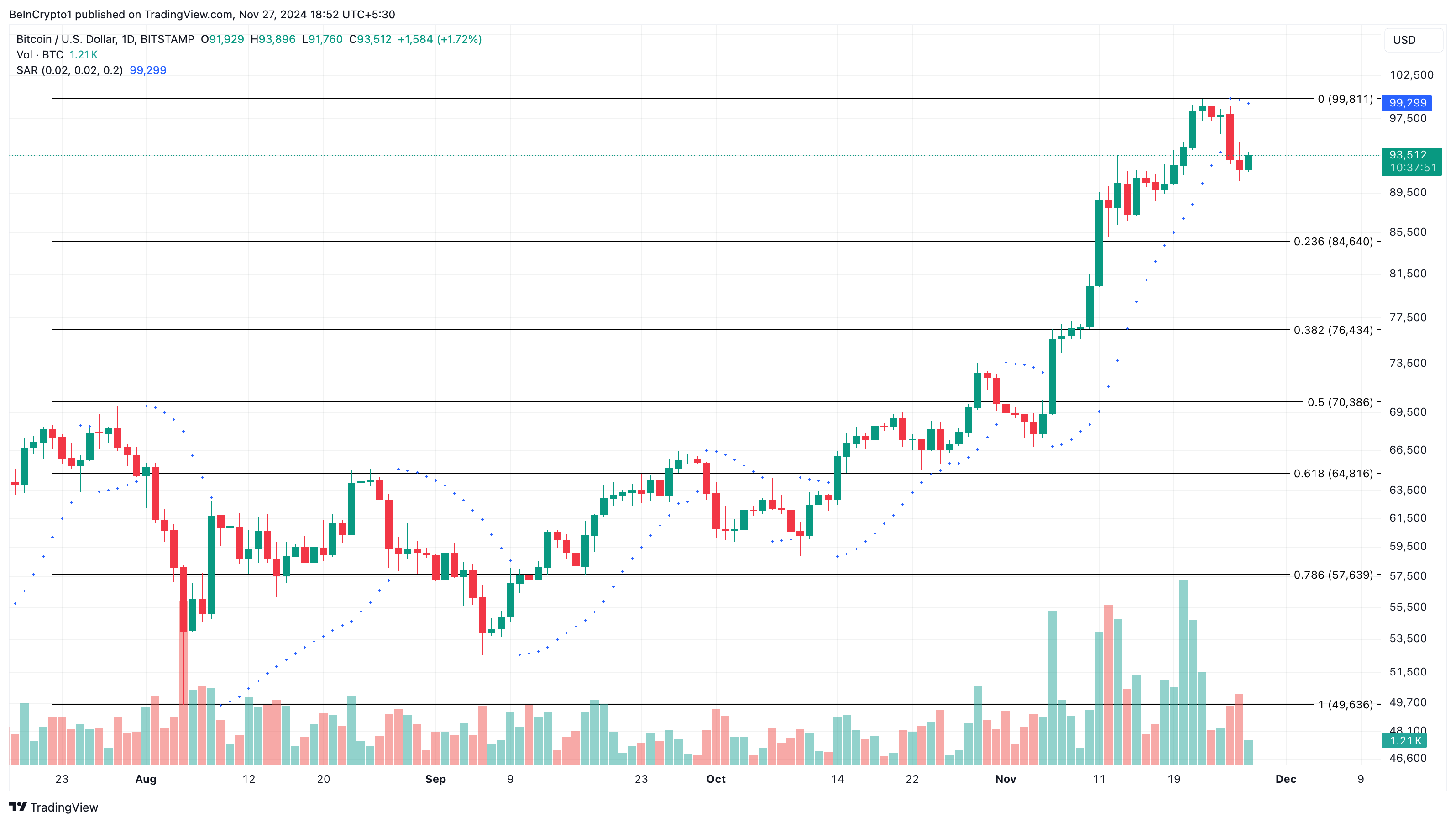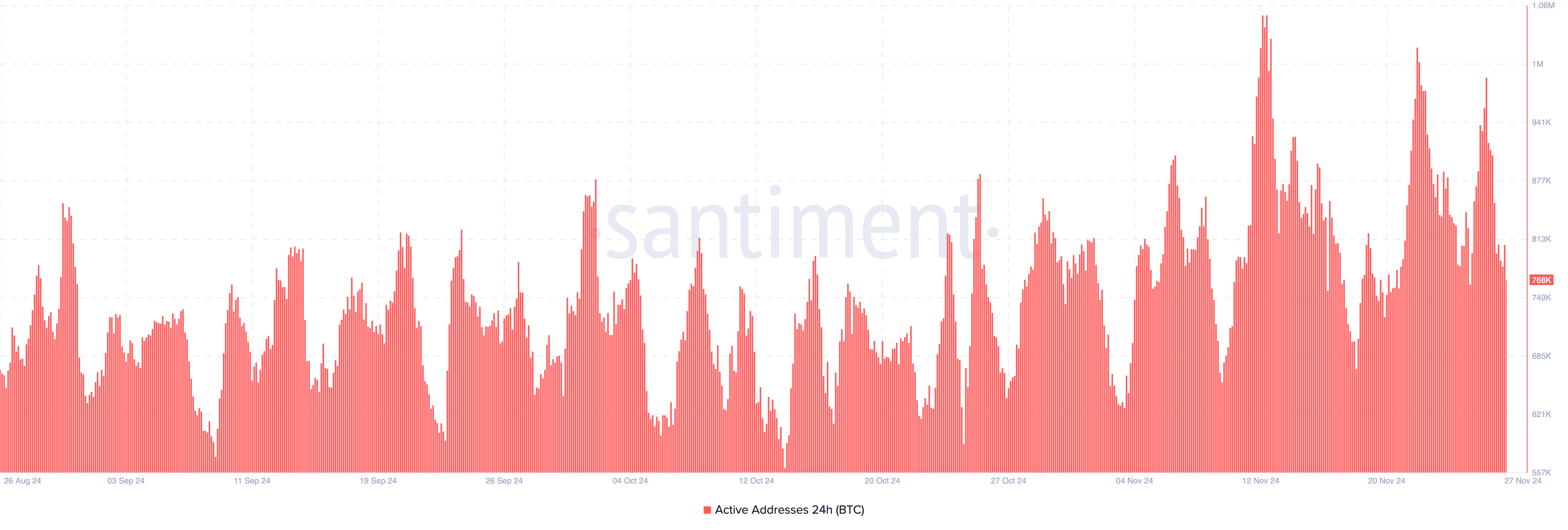 Marraskuun 26. päivänä Bitcoinin aktiivisia osoitteita oli lähes miljoona, mikä on osoitus vetovoimasta. Tätä kirjoitettaessa luku on kuitenkin pudonnut 768 000:een, joten se on laskussa. Jos aktiivisten osoitteiden toiminta vähenee edelleen, voi se viitata heikentyneeseen markkinatunnelmaan ja edistää hinnan laskua, kuten aiemmin korostettiin.