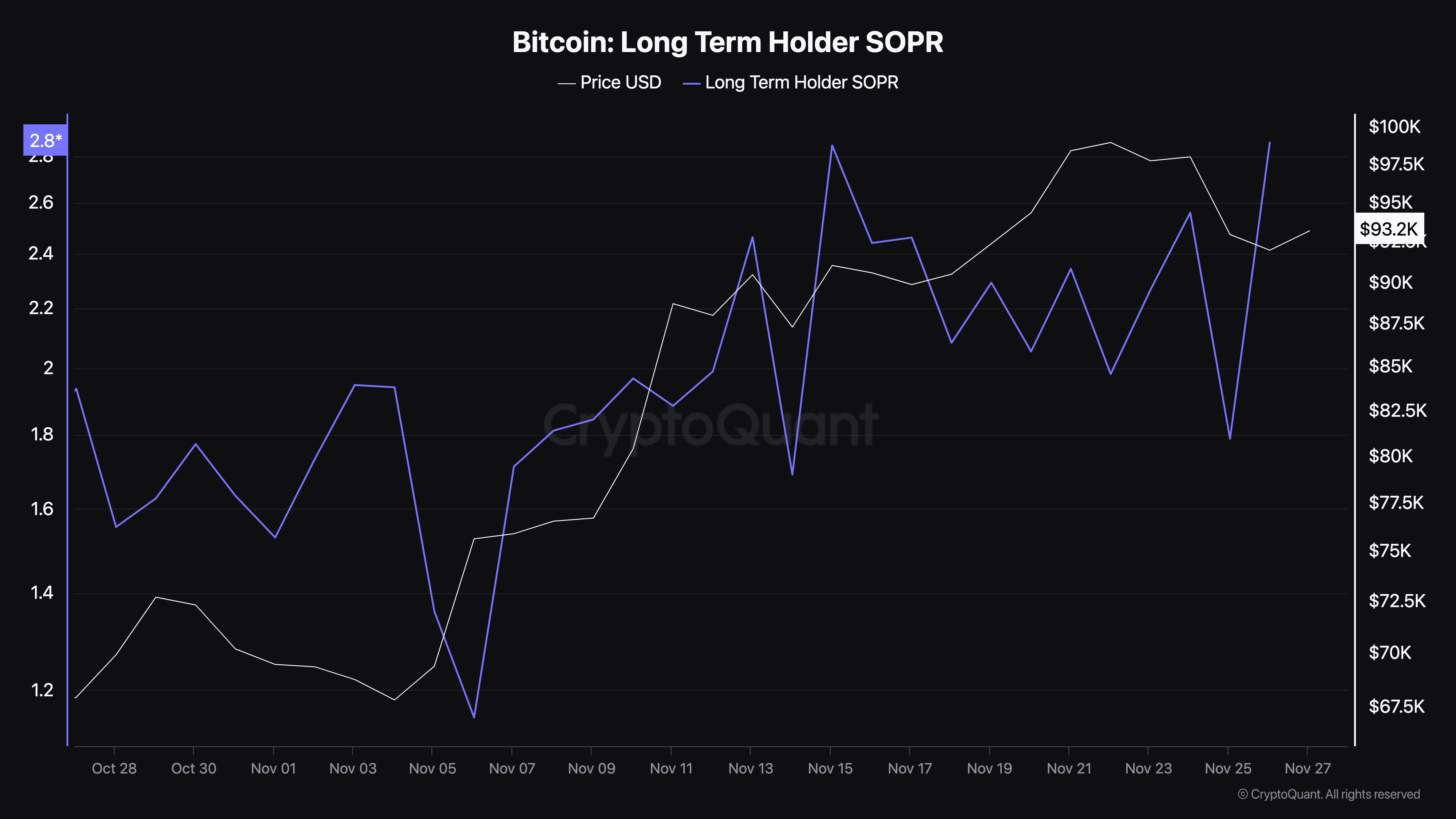 CryptoQuantin mukaan Bitcoinin pitkäaikainen voittojen tuottosuhde on noussut 2,86:een. Suhde mittaa pitkäaikaisten sijoittajien toimintaa, jotka ovat pitäneet kolikkoa yli 155 päivää.