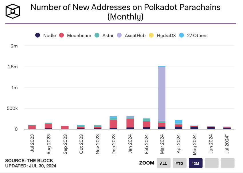 Vastaava lasku on havaittu myös Polkadot-verkon parachaineilla. Tarkastelukuukauden aikana näiden ketjujen uusien osoitteiden määrä on laskenut 21%.