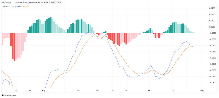 Kuitenkin liukuvien keskiarvojen konvergenssi-divergenssi (MACD) -indikaattori ei tue tätä tunnelmaa. MACD-indikaattori osoittaa, että härkämäinen vauhti on hiipumassa. Tekninen signaali viittaa siihen, että ylöspäin suuntautuva liike menettää voimaansa.