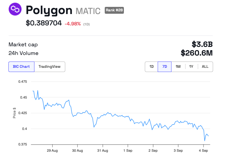 Huolimatta näistä optimistisista kehityksistä, MATICin arvo on laskussa, ja sen nykyinen kauppahinta on 0,3897 dollaria, mikä on 5 % lasku viimeisen 24 tunnin aikana.