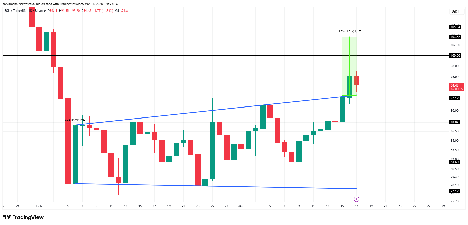 Todennäköisyys, että 100 dollarin raja rikkoutuu, on yhä pieni jatkuvien pörssisijoitusten ja korkeiden NVT-lukujen vuoksi. SOL voi pudota takaisin alle 92 dollarin lähiaikoina, jos myyntipaine kasvaa. Nousu voi jäädä vajaaksi ilman tukevampia perusfundamentteja.