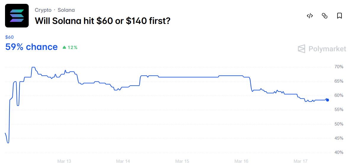 Epätietoisuus näkyy Polymarketin yhteisössä. Todennäköisyys, että SOL laskee ensin 60 dollariin, on laskenut kolmessa päivässä 70 prosentista 59 prosenttiin, mikä heijastaa kasvavaa epävarmuutta karhujen näkemyksestä. Tällä hetkellä SOL ei todennäköisesti saavuta kumpaakaan hintaa.