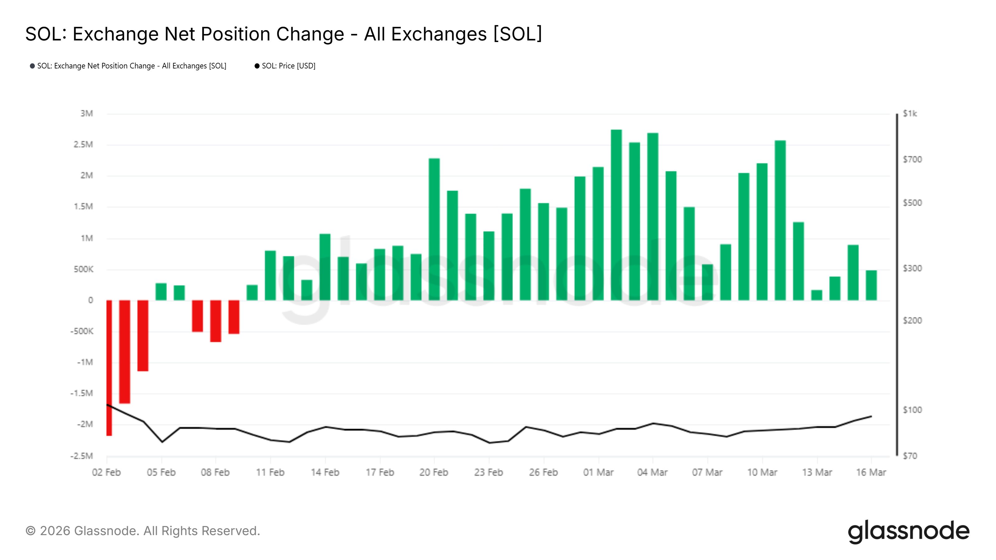 Pörssien nettosaldojen muutos osoittaa, että SOL:n sijoitukset kaupankäyntialustoille eivät ole täysin kääntyneet laskuun. Jatkuvat talletukset pörsseihin viittaavat yhä myyntikäyttäytymiseen, kun haltijat siirtävät tokeneita takaisin myyntiä varten. Tämä jatkuva suuntaus heikentää nykyisen nousuyrityksen vakuuttavuutta.