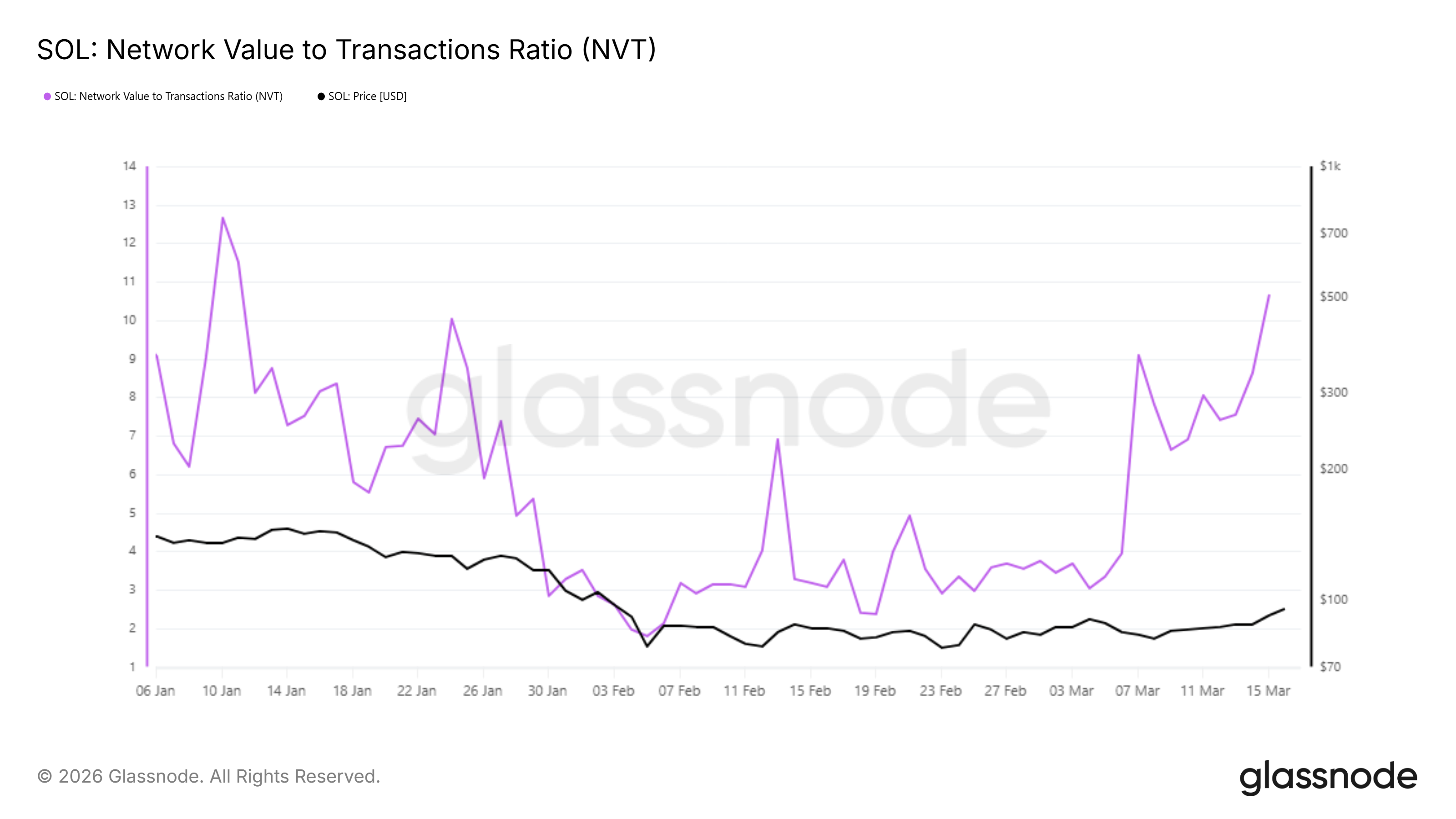 Network Value to Transactions Ratio (NVT) varoittaa Solanasta. NVT:n nousu osoittaa, että verkon arvo kasvaa nopeammin kuin mitä todellinen siirtovolyymi voi perustella. Tämä hintakehityksen ja lohkoketjun käytön ero on aiemmin ennakoinut hintojen kääntymistä, kun spekulatiivinen hype peittoaa todellisen aktiviteetin.