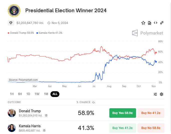 Polymarketin tietojen mukaan Trump johtaa tällä hetkellä 58,3 prosentin ennustetulla voittotodennäköisyydellä, kun taas Harrisilla on 41,8 prosenttia. Trumpiin kohdistuva vedonlyönti on ollut erityisen kiivasta, saavuttaen 1,279 miljardin dollarin volyymin verrattuna Harrisin 804,7 miljoonaan dollariin.