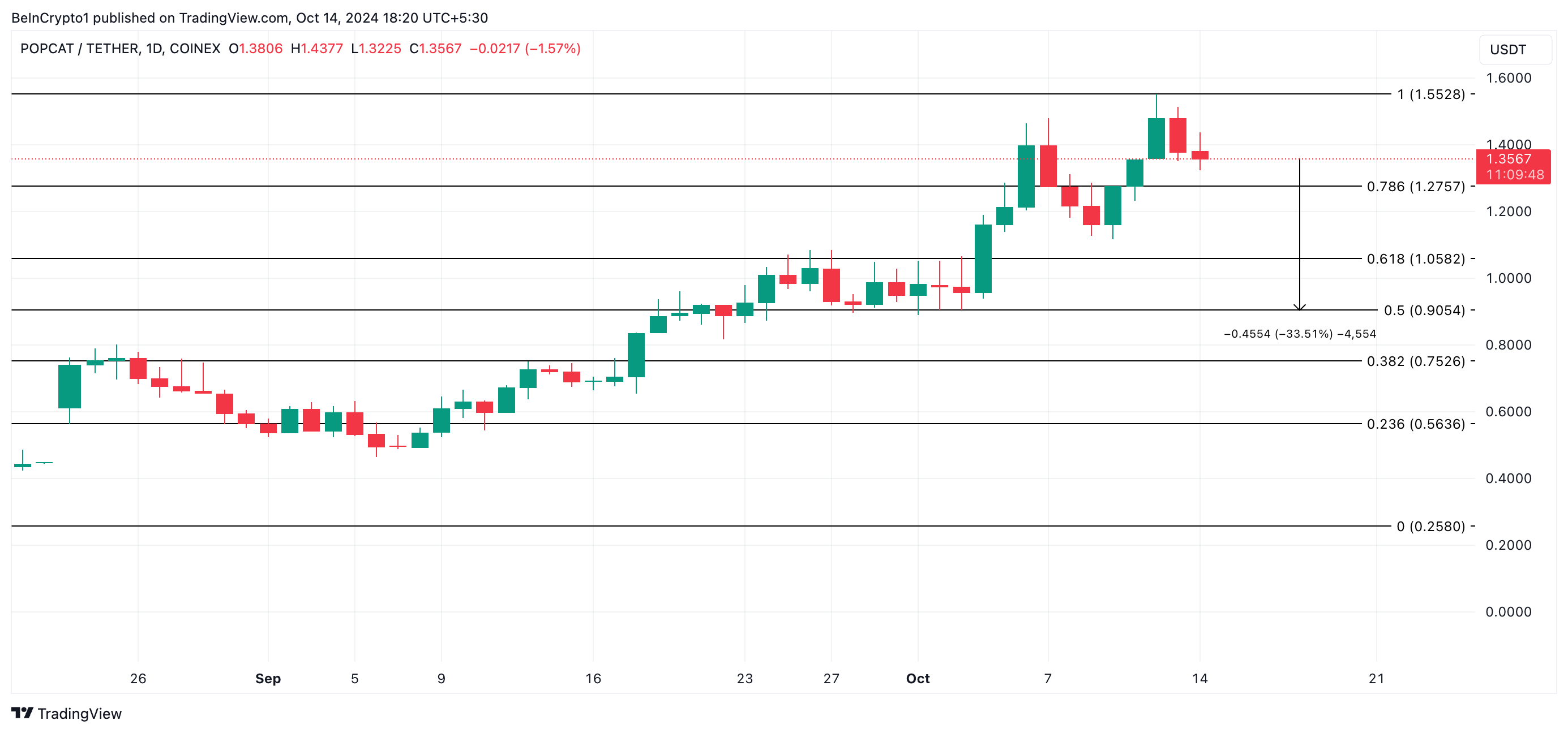 Fibonacci Retracement -työkalun käyttö viittaa siihen, että meemikolikon arvo voisi laskea 34 %, mahdollisesti asettuen keskeiselle tukitasolle 0,90 dollaria.