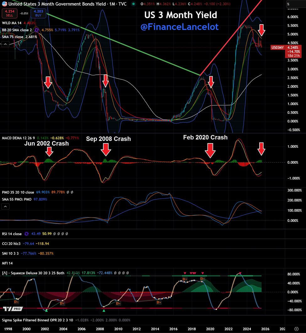 Pitkän aikavälin tarkastelu Yhdysvaltojen 3 kuukauden tuotosta paljastaa toistuvan 40 vuoden trendin, jossa piikit edeltävät suuria markkinaromahduksia. Viimeisin nousu vastaa historiallisia ennen romahdusta olevia tasoja, mikä vihjaa, että sykli saattaa toistua nykyisillä markkinoilla.