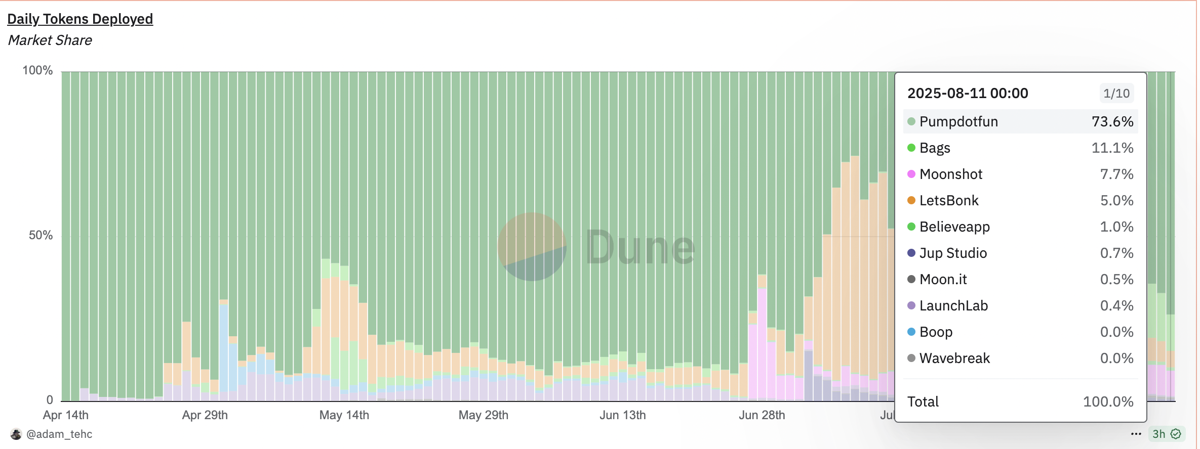 Pump.fun menetti hetkellisesti hallintansa heinäkuussa, kun LetsBonk nousi hallitsemaan jopa 74 % päivittäisistä meemikolikkojen lanseerauksista verkossa. Kesän huipun hiipuessa LetsBonkin hallinta alkoi heikentyä, mikä avasi oven Pump.funille paluuseen.