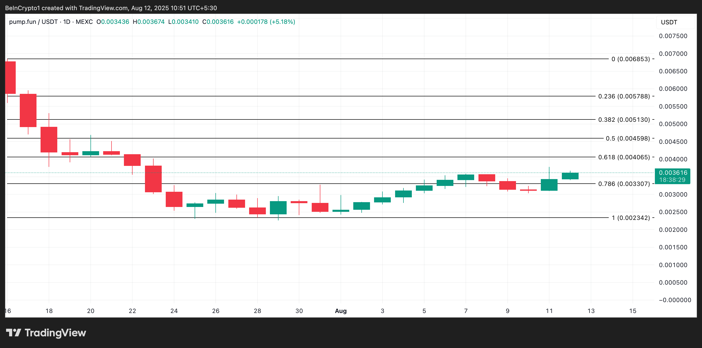 Pump.fun:n hallinnan asteittainen kasvu on lisännyt kysyntää PUMPille, nostaen tokenin moniviikkoiseen huippuun 0,003616 dollaria kirjoitushetkellä.