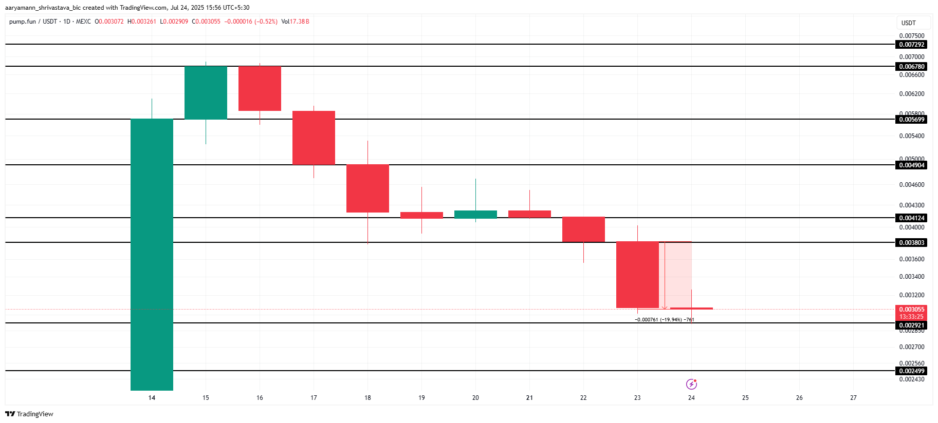 Token pysyy avaintukitasolla 0,002921 dollaria, mutta tämä tuki on heikko. Jos PUMP ei onnistu ylläpitämään tätä tasoa, se voi jatkaa laskuaan, mahdollisesti pudoten 0,002499 dollariin. Tämä vahvistaisi laskutrendin jatkumisen, ja hinta voisi laskea edelleen.