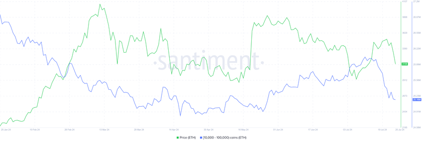 Tämä liike ei ole uusi, sillä heidän myyntinsä on jatkunut viimeiset kaksi viikkoa. Tänä aikana he ovat onnistuneet myymään yli 840 000 ETH:n arvosta, joka on hieman yli 2,65 miljardia dollaria. Nämä toimet suorittaneet osoitteet omistavat 10 000–100 000 ETH:ta ja ne yleensä vaikuttavat hintaan.