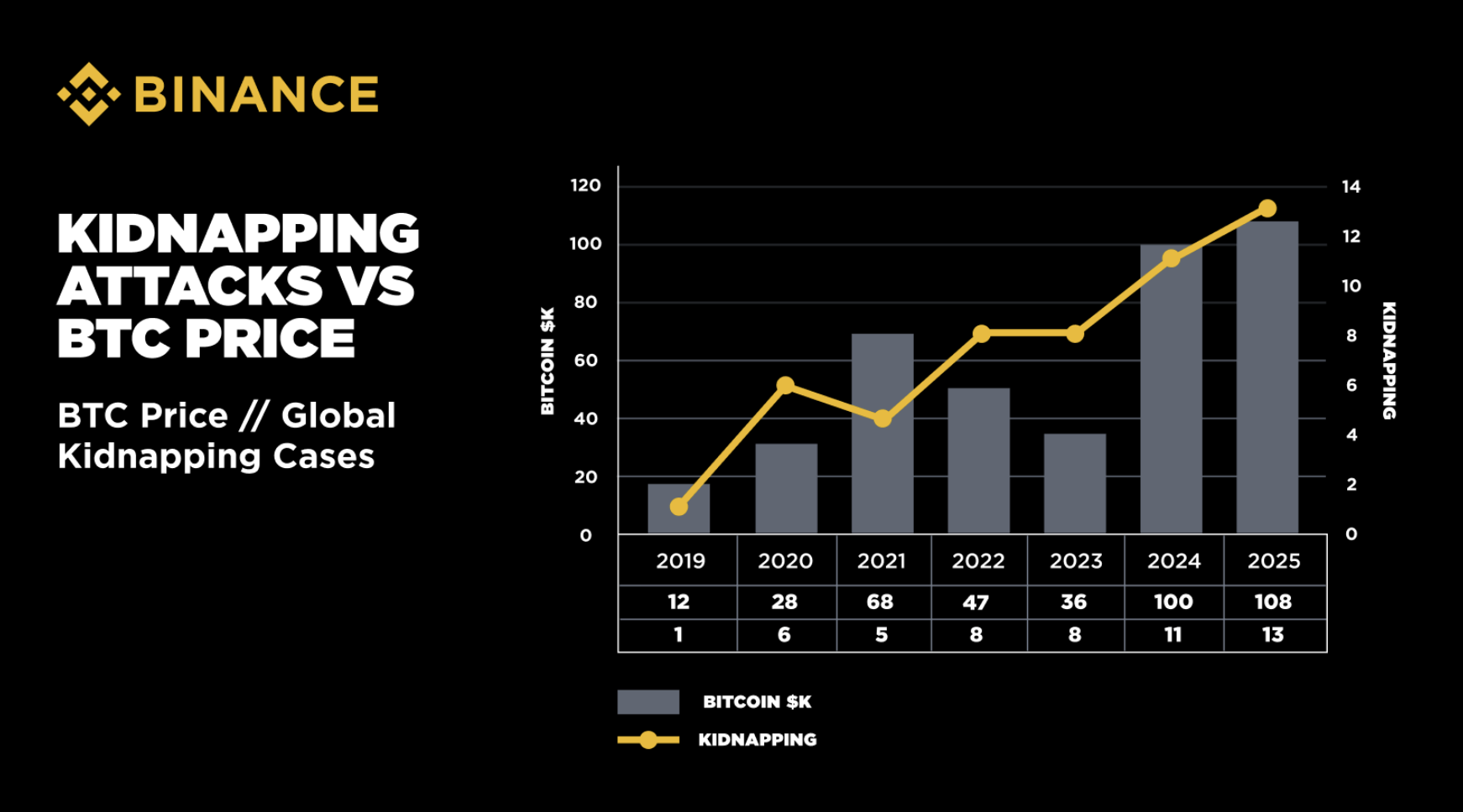 “Tietomme osoittavat fyysisten hyökkäysten määrän kasvun krypto käyttäjiä kohtaan vuodesta 2021 lähtien, ja BTC:n hinta korreloi vahvasti tällaisten tapausten määrän kanssa. Kun alan digitaaliset puolustukset vahvistuvat, rikolliset siirtyvät yhä enemmän reaalimaailman taktiikoihin,” Binancen edustaja kertoi BeInCryptolle.