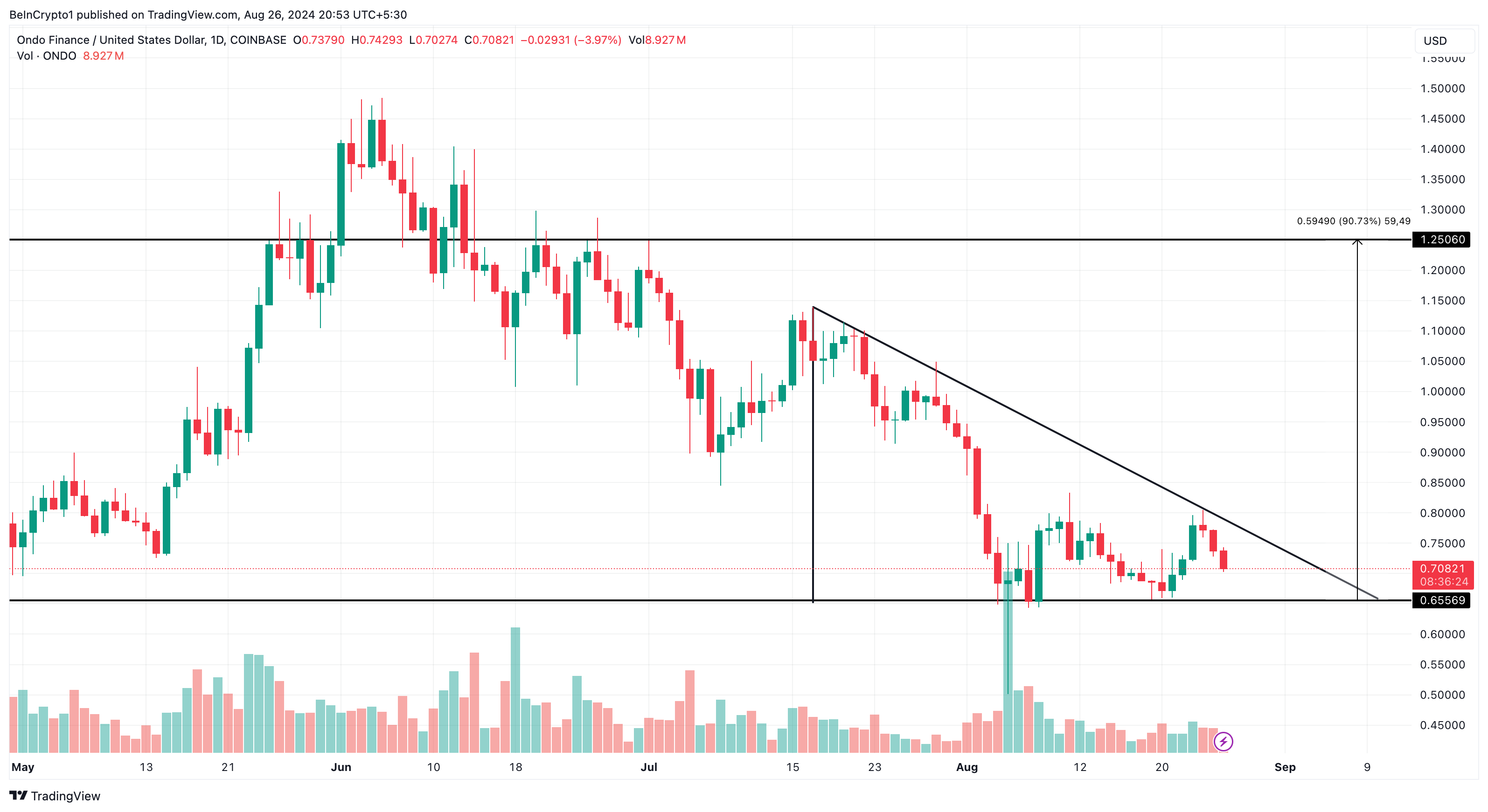 Teknisestä näkökulmasta myyjien uupumus näyttää asettuvan, kun token muodostaa laskevan kolmion. ONDO käy tällä hetkellä kauppaa 0,70 dollarin hintaan ja saattaa liukua kohti 0,65 dollarin tukea.
