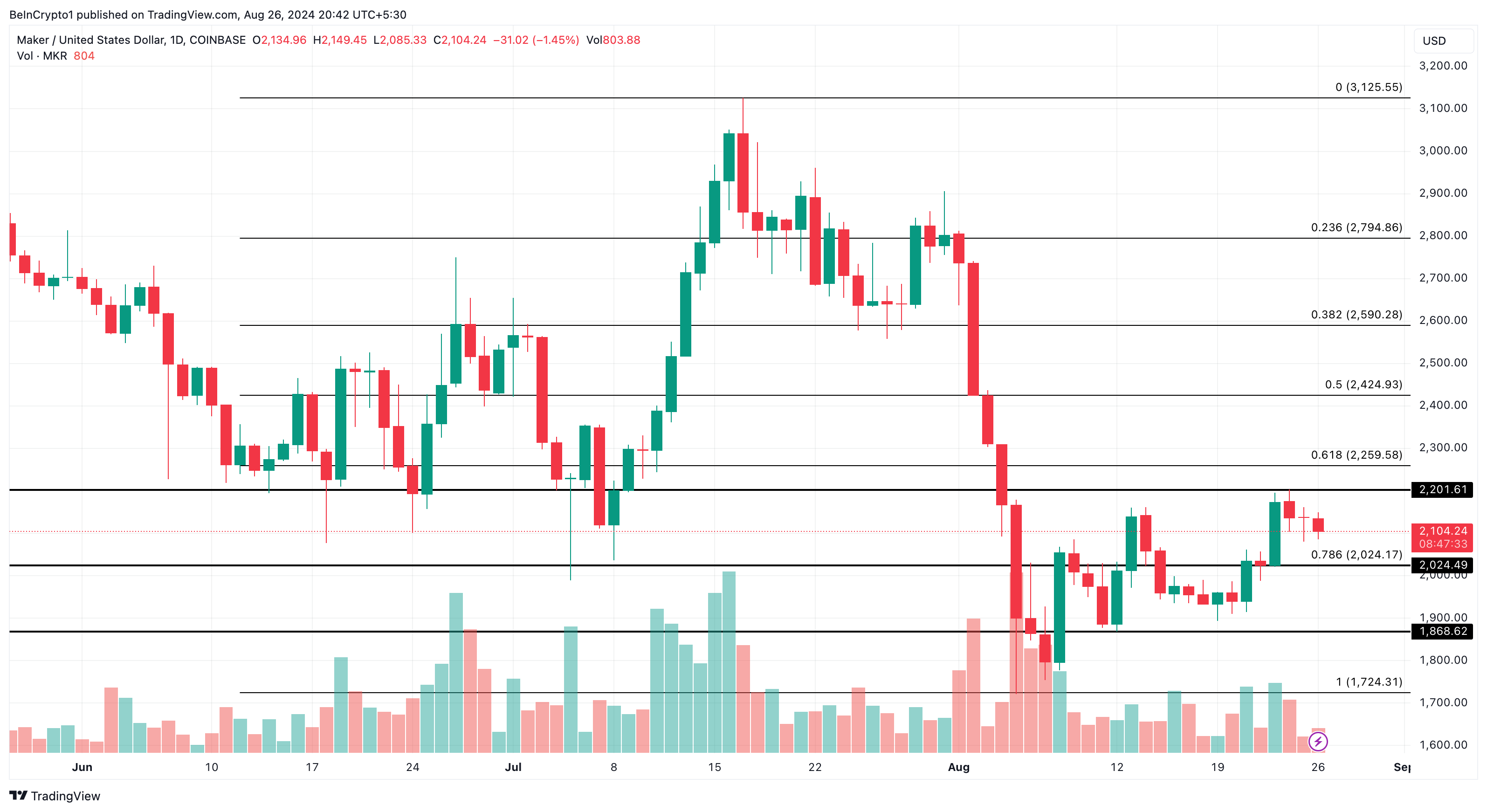 Päivittäisen kaavion mukaan MKR on käynyt kauppaa kapealla välillä 1 868 ja 2 201 dollarin välillä elokuun 8. päivästä lähtien. Karhut näyttävät yrittävän toista työntöä alle 2 000 dollarin tason, mutta vahva tuki 2 024 dollarissa saattaa auttaa pitämään hinnan tuon keskeisen kynnysarvon yläpuolella.