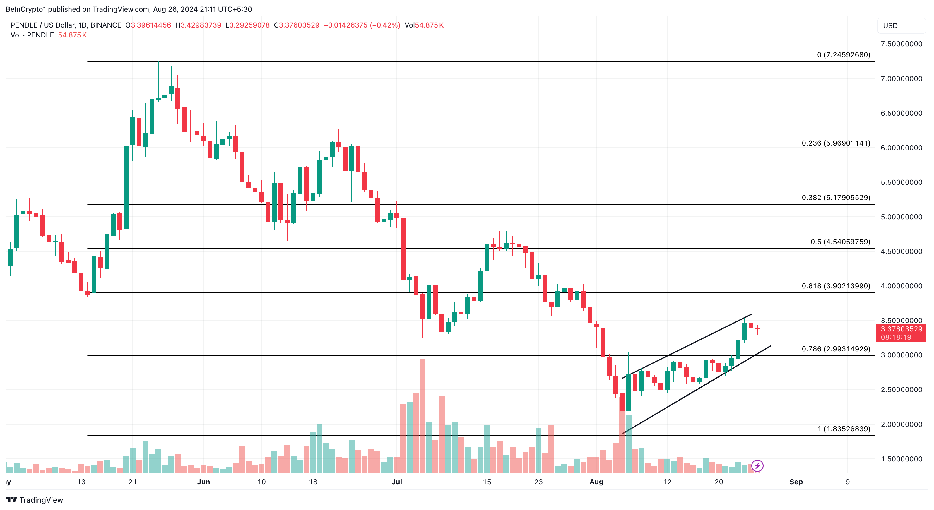 Viimeisen seitsemän päivän aikana PENDLE:n hinta on noussut lähes 20%. Päivittäisen kaavion mukaan token käy kauppaa nousevassa kanavassa. Tuottopotentiaalinsa ansiosta PENDLE saattaa herättää enemmän kiinnostusta markkinaosapuolten keskuudessa.