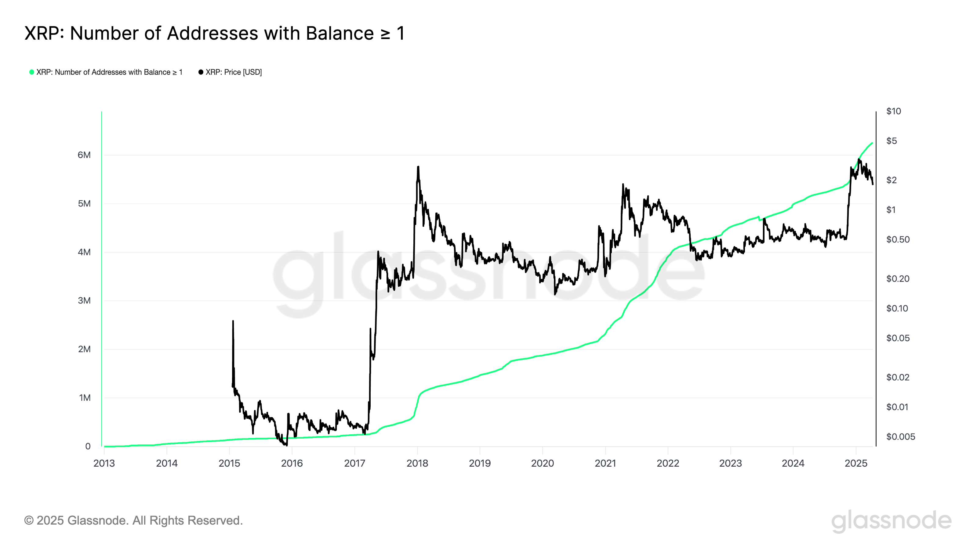 Mielenkiintoista on, että monet näyttävät jakavan saman uskon. Huolimatta viimeaikaisesta volatiliteetista, pienten sijoittajien kiinnostus XRP:hen on kasvussa. Glassnoden tuoreiden tietojen mukaan osoitteet, jotka pitävät hallussaan 1 XRP:tä tai enemmän, ovat saavuttaneet kaikkien aikojen ennätyksen 6,2 miljoonaa.