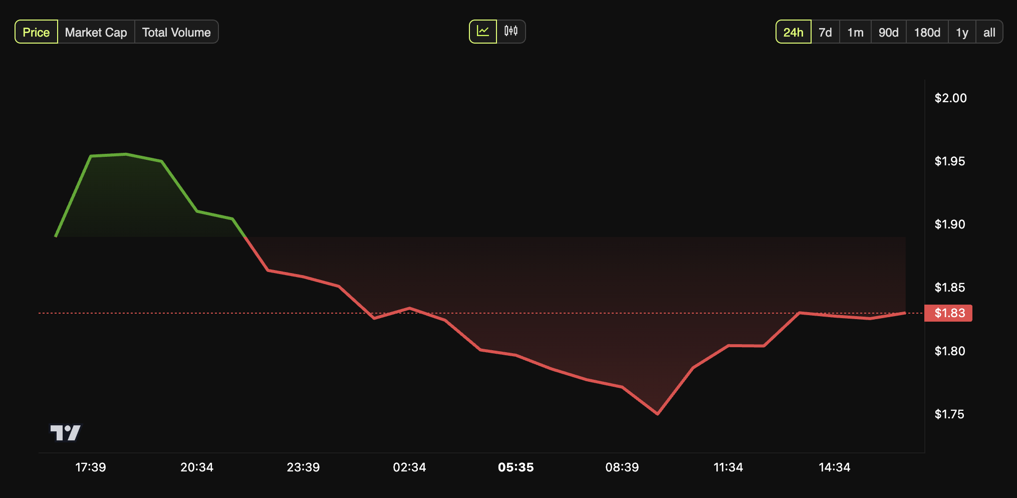 Optimismista huolimatta XRP jatkaa kamppailua laajemman markkinaromahduksen keskellä. Viimeisen päivän aikana altcoin on pudonnut 2,9 %. Kirjoitushetkellä se oli kaupankäynnissä 1,8 dollarilla.