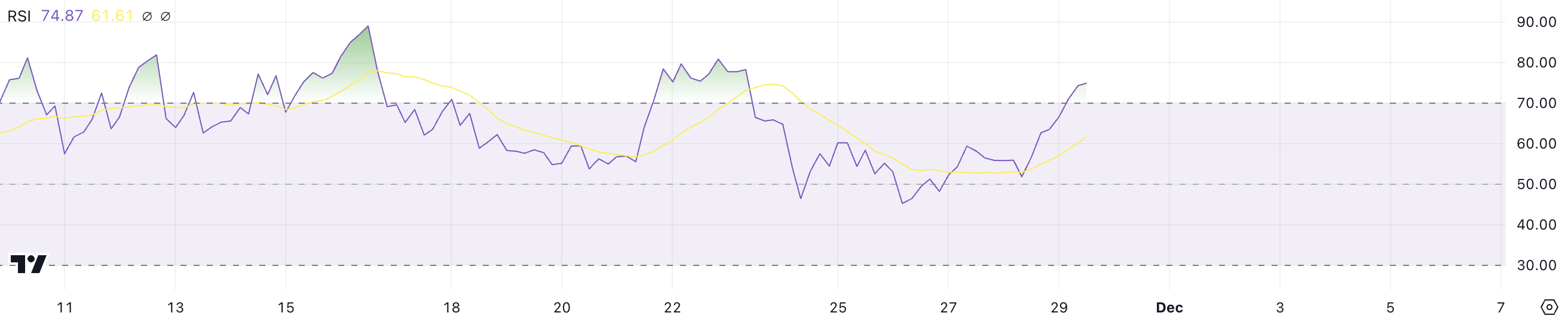 Ripple RSI on tällä hetkellä 74,8, mikä heijastaa vahvaa nousevaa suuntausta viimeaikaisen nousun jälkeen. RSI eli Relative Strength Index mittaa hintamuutosten nopeutta ja suuruutta asteikolla 0–100. Arvot yli 70 viittaavat yliostettuun tilaan ja mahdolliseen korjaukseen, kun taas alle 30 arvot viittaavat ylimyytyyn tilaan ja mahdolliseen palautumiseen.