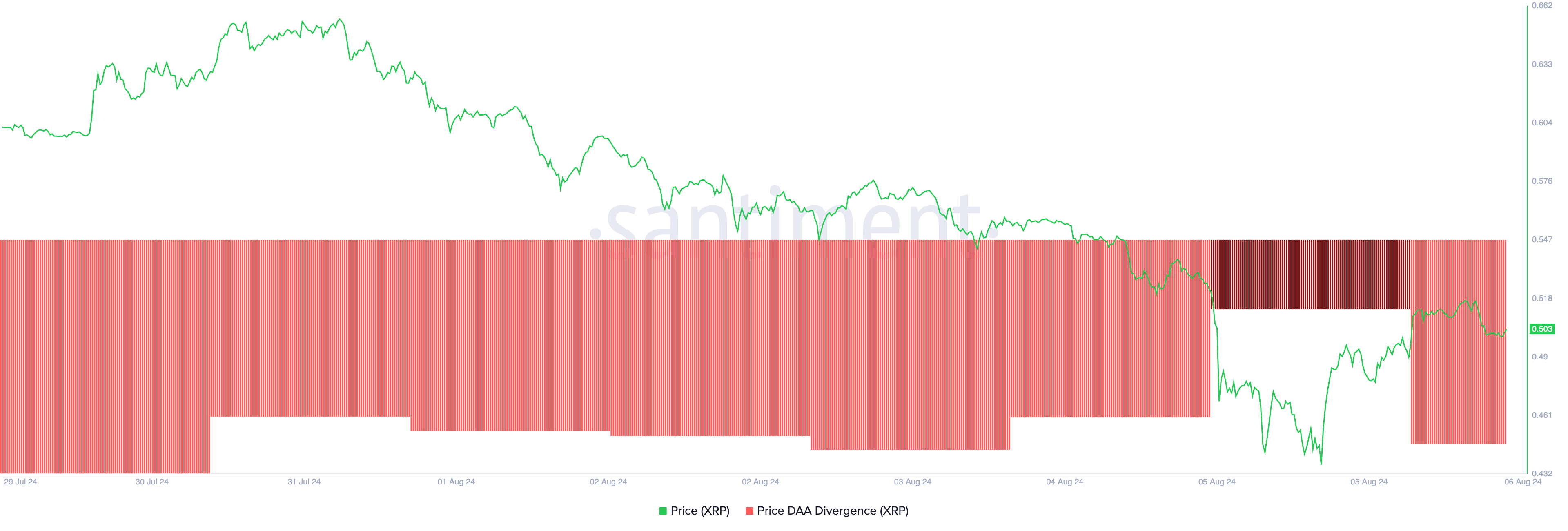Tätä kirjoitettaessa XRP:n hinta DAA -ero on -51,65%. Negatiivinen hinta DAA -ero hinnannousun aikana osoittaa, että käyttäjätoiminta tai verkon sitoutuminen ei tue rallia. Tämä ero aina viestii heikosta ja kestämättömästä rallista.