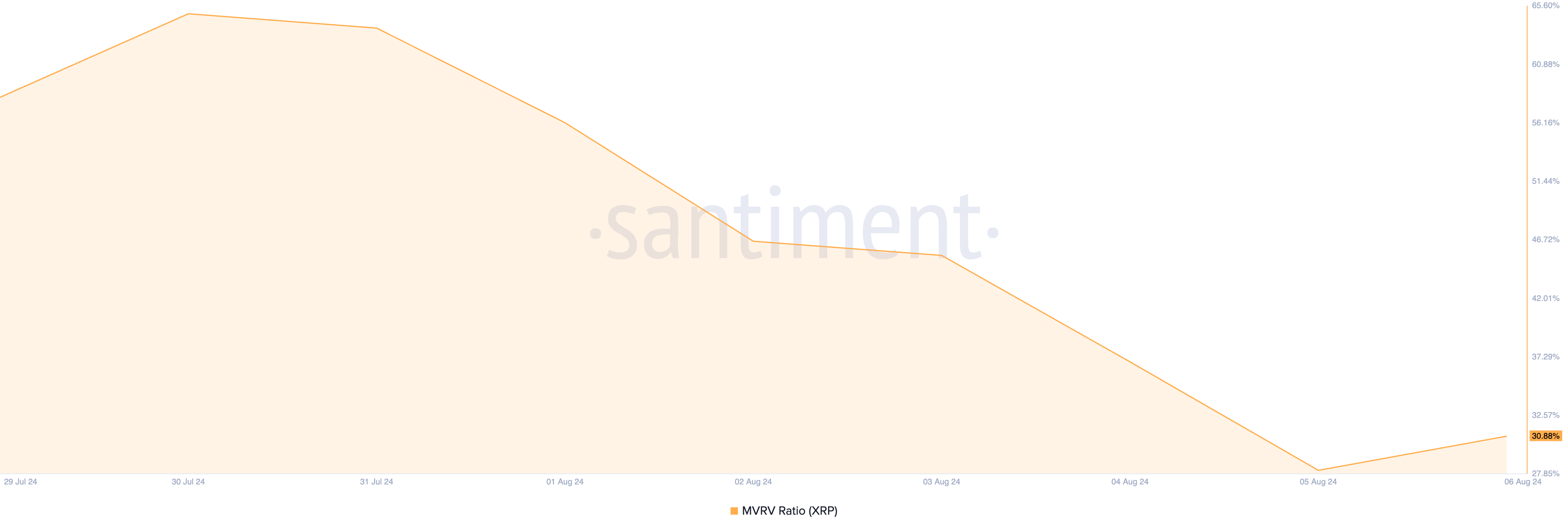 Lisäksi XRP:n positiivinen markkina-arvon ja toteutuneen arvon (MVRV) suhde asettaa myyntipainetta sille. Tätä kirjoitettaessa altcoinin MVRV-suhde on 30,88.