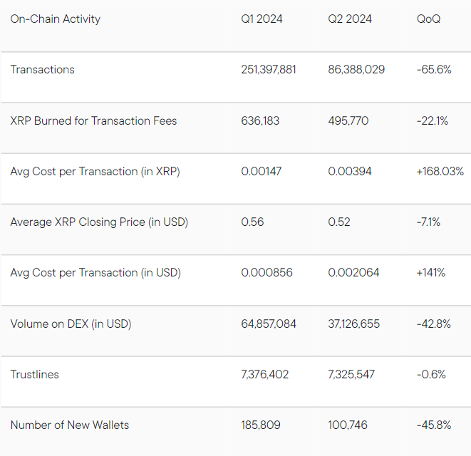 Vuoden 2024 toisella neljänneksellä XRPL kirjasi 86,39 miljoonaa tapahtumaa, mikä on 65,6 % vähemmän kuin edellisellä neljänneksellä. Huolimatta tästä laskusta, keskimääräiset tapahtumamaksut verkossa nousivat 168 % ja olivat 0,00394 XRP.