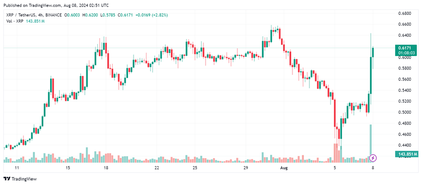 Oikeuden päätöksen jälkeen XRP:n hinta nousi merkittävästi. Se nousi 0,5018 dollarista 0,6373 dollariin, mikä merkitsee 27 %:n kasvua vain puolentoista tunnin aikana. Kirjoitushetkellä XRP:n hinta on vakiintunut ja on tällä hetkellä 0,6171 dollaria.
