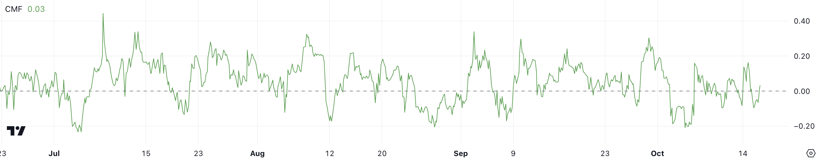 Chaikin Money Flow on tekninen indikaattori, joka mittaa omaisuusvaran ostovoimaa ja myyntivoimaa perustuen kauppojen sulkemishintaan ja volyymiin. Positiiviset CMF-arvot osoittavat nettomyyntivoimaa, kun taas negatiiviset arvot viittaavat nettomyyntivoimaan.
