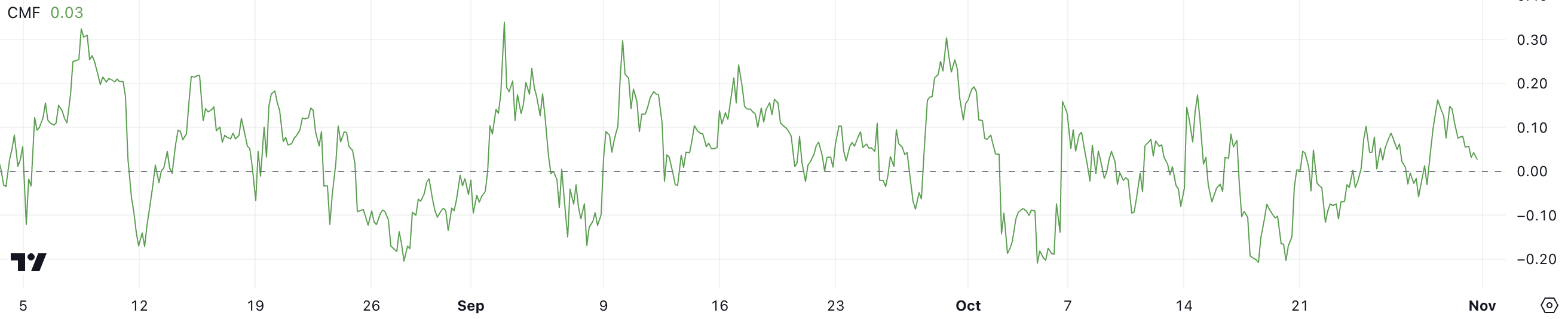 CMF on indikaattori, joka mittaa ostamisen ja myymisen painetta perustuen hintaan ja volyymiin. Arvot yli nollan osoittavat ostovoimaa, kun taas arvot alle nollan viittaavat myyntipaineeseen.