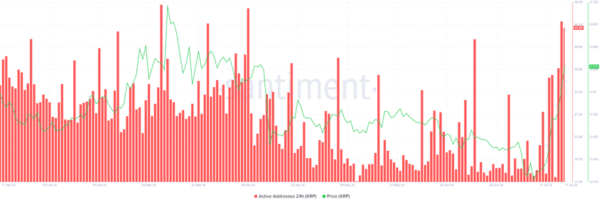 Verkostoon osallistuminen on myös lisääntynyt. Verkossa transaktioita tekevien sijoittajien määrä kasvoi päivittäisestä keskiarvosta 27 000:sta 43 700:aan viikon parhalla lukemalla, mikä on XRP:n omistajien paras saavutus viimeisen kolmen kuukauden aikana. Hinnannousu kiinnosti sijoittajia, joka johti aktiivisiin osoitteisiin, ja näitä pidetään yleensä ostosignaalina.