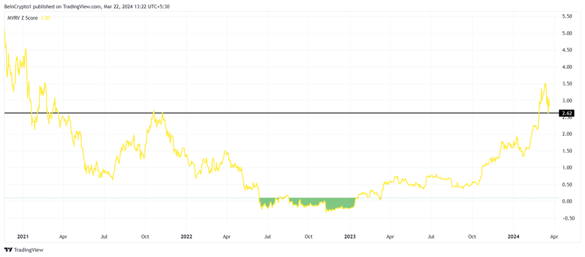 Tämä käy ilmi markkina-arvon ja realisoidun arvon (MVRV) Z-Score-arvosta. Indikaattori mittaa markkina-arvon ja toteutuneen arvon suhdetta, mikä osoittaa, onko omaisuuserä yli- vai aliarvostettu, suhteessa sen historiallisiin hintakehityksiin. Korkea positiivinen pistemäärä viittaa mahdolliseen yliarvostukseen, kun taas matala tai negatiivinen pistemäärä, viittaa mahdolliseen aliarvostukseen.