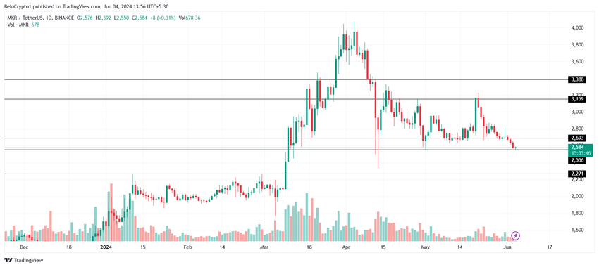 Makerin hinta on tällä hetkellä kolmen kuukauden alimmillaan 2 384 dollarissa. Altcoin on ollut laskutrendissä huhtikuun alusta lähtien ja pudonnut korkeimmasta 4 000 dollarista nykyiseen hintapisteeseensä.