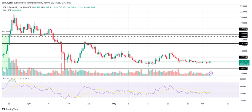 ICP on ollut yksi hitaimmin liikkuvista varoista viimeisen puolentoista kuukauden aikana, eikä se ole juurikaan liikkunut mihinkään suuntaan paitsi sivuttain. Altcoin suosii edelleen laskevaa puolueellisuutta, ja sen arvo on ollut 12,12 dollaria, kun se ei ole rikkonut 15,34 dollaria.
