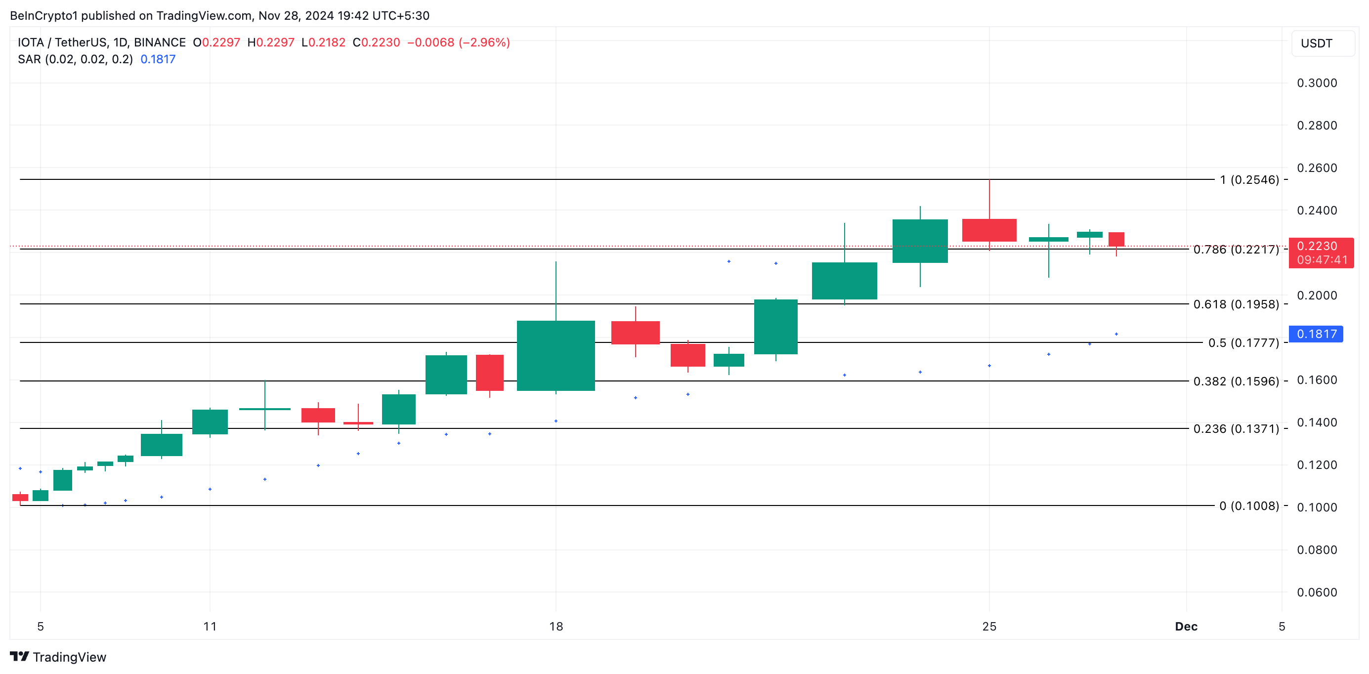 IOTA, hajautetun, avoimen lähdekoodin hajautetun kirjanpitoteknologian IOTA:n natiivi token, on yksi RWA altcoineista, joita kannattaa seurata tarkasti tänä joulukuussa. Tällä hetkellä sen hinta on 0,22 dollaria, ja altcoin on vetäytynyt hieman seitsemän kuukauden huipustaan, 0,25 dollaria, joka saavutettiin maanantain kaupankäyntisessiossa.