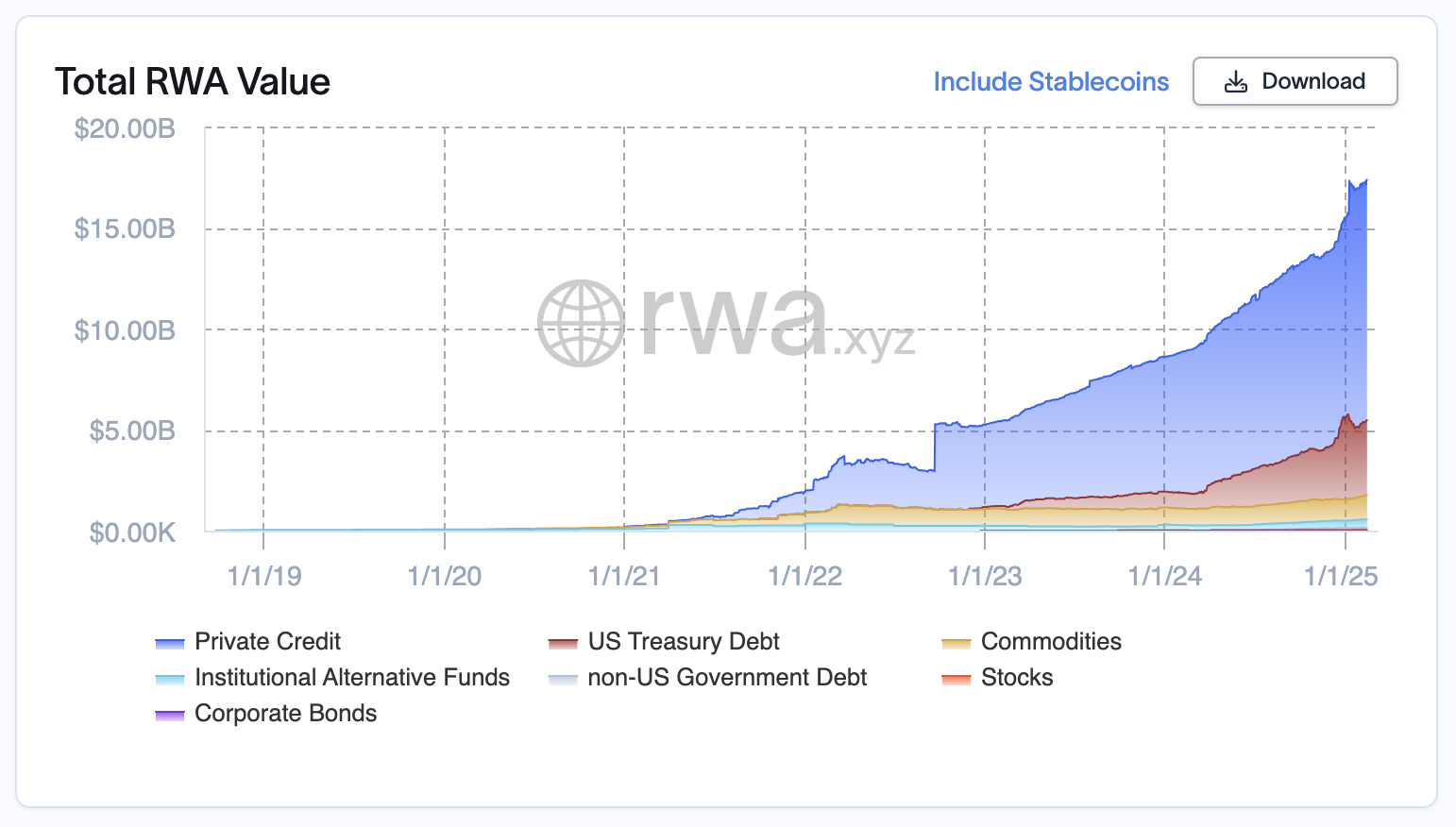 Tällä hetkellä Private Credit hallitsee RWA-markkinoita, muodostaen 11,9 miljardia dollaria kokonaisarvosta. Sitä seuraavat Yhdysvaltain valtionvelka 3,7 miljardilla dollarilla ja hyödykkeet 1,2 miljardilla dollarilla.
