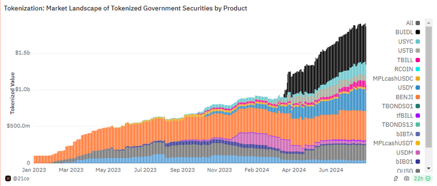21.co-analyytikon äskettäisen raportin mukaan odotetaan, että tämä suuntaus DAOissa ja DeFi-projekteissa tulee ajamaan tokenisoidun Yhdysvaltain valtion velkakirjamarkkinan 3 miljardin dollarin arvoon vuoden 2024 loppuun mennessä. Tämä ennuste on myös linjassa markkinoiden 200 %:n kasvuvauhdin kanssa. 21.co:n tiedot paljastavat tämän segmentin arvon nousun 592,63 miljoonasta dollarista 1,78 miljardiin dollariin vuoden alusta tähän päivään.